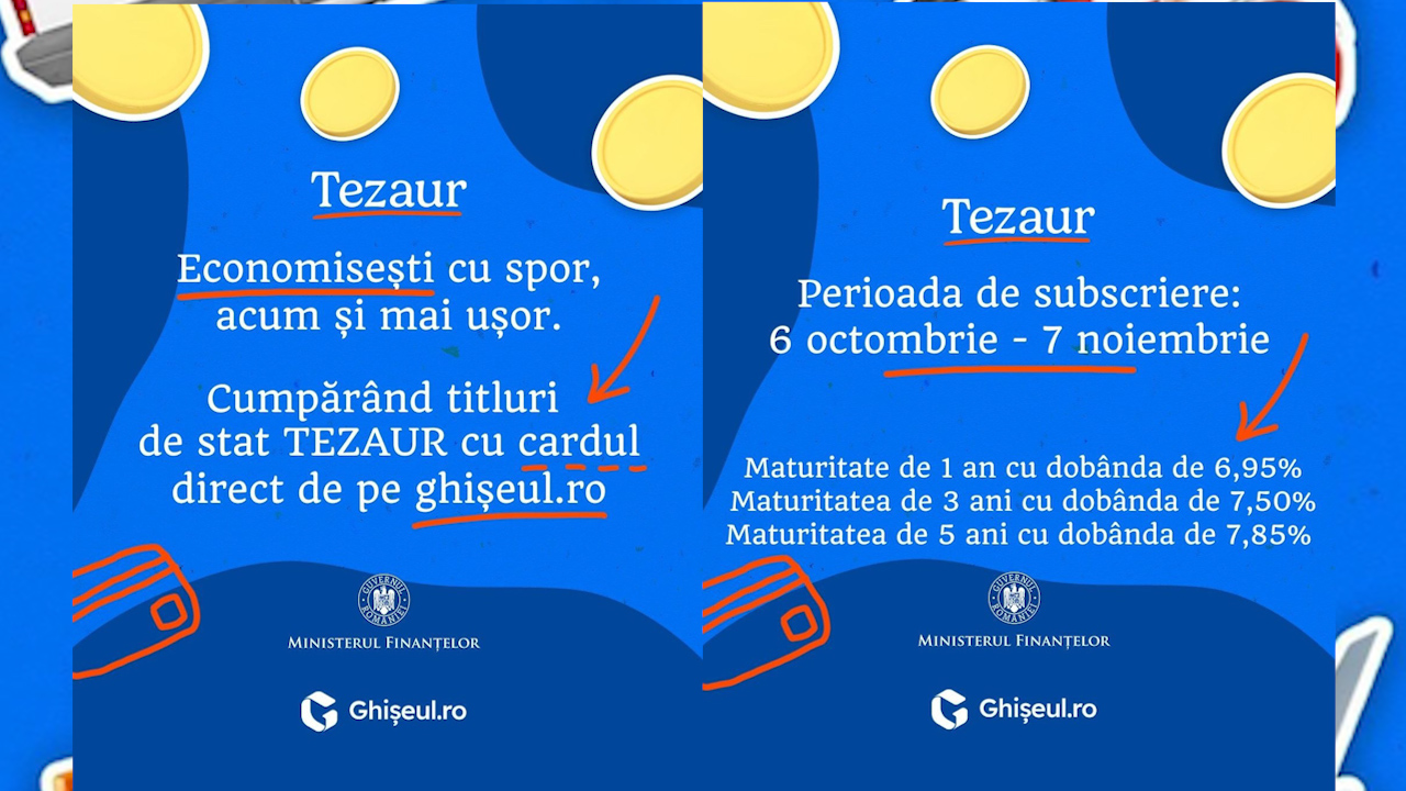 În perioada 6 octombrie – 7 noiembrie 2025, românii pot investi în titlurile de stat TEZAUR, cu maturități de 1, 3 și 5 ani și dobânzi anuale de 6,95%, 7,50%, respectiv, 7,85%. Veniturile obținute sunt neimpozabile. Titlurile de stat au valoare nominală de 1 leu și sunt emise în formă dematerializată.