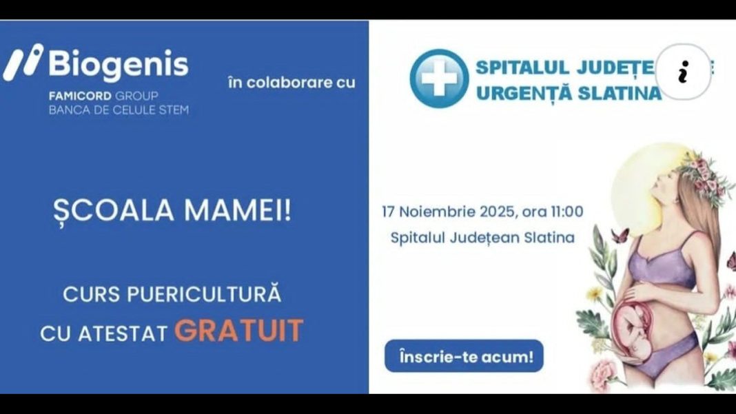Spitalul Județean de Urgență Slatina în parteneriat cu Biogenis – banca de celule stem organizează, în data de 17 noiembrie 2025, „Școala Mamei”, un eveniment dedicat viitorilor părinți. Medicii specialiști din cadrul Secțiilor Obstetrică-Ginecologie și specialiști în puericultură vor discuta cu pacientele gravide și viitorii tătici despre sarcină, naștere, recoltarea de celule stem, îngrijirea bebelușului, alăptare”.