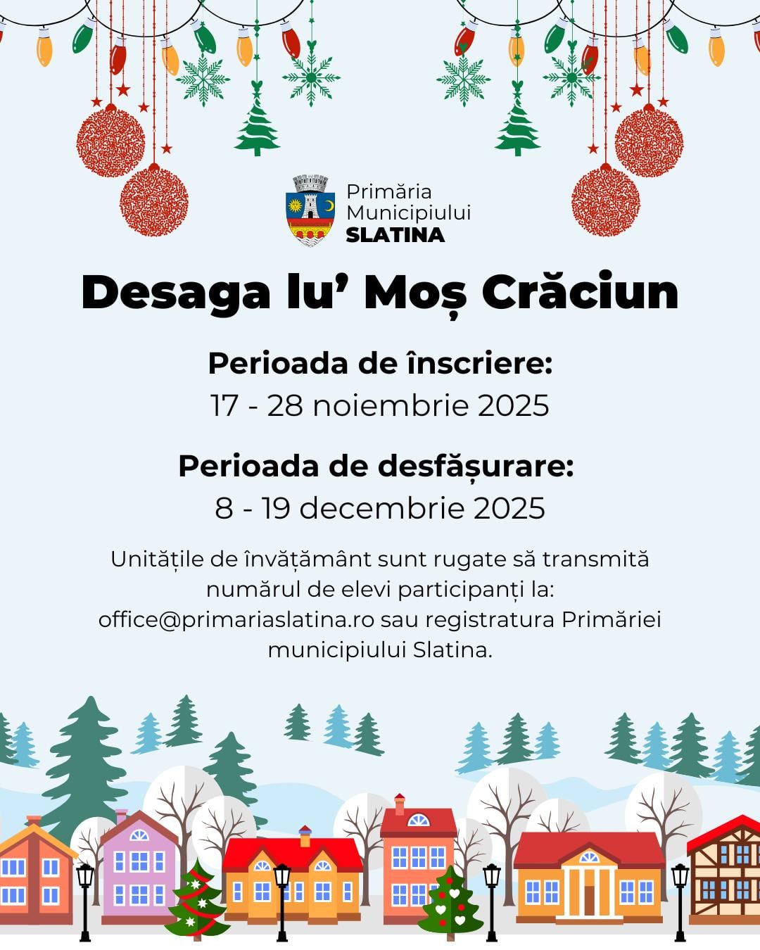 Primăria municipiului Slatina dă startul înscrierilor pentru programul „Desaga lu’ Moș Crăciun”, derulat în preajma sărbătorilor de iarnă, și invită grădinițele și școlile, clasa pregătitoare – clasa a III-a din oraș să se alăture unui frumos maraton de colinde și momente artistice dedicate Crăciunului.