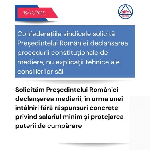 Confederația Națională Sindicală „Cartel ALFA” a participat la întâlnirea din data de 26 noiembrie cu Consilierul Prezidențial Radu Burnete, în contextul solicitării adresate Președintelui României de a media conflictul social dintre organizațiile sindicale și reprezentanții Guvernului.