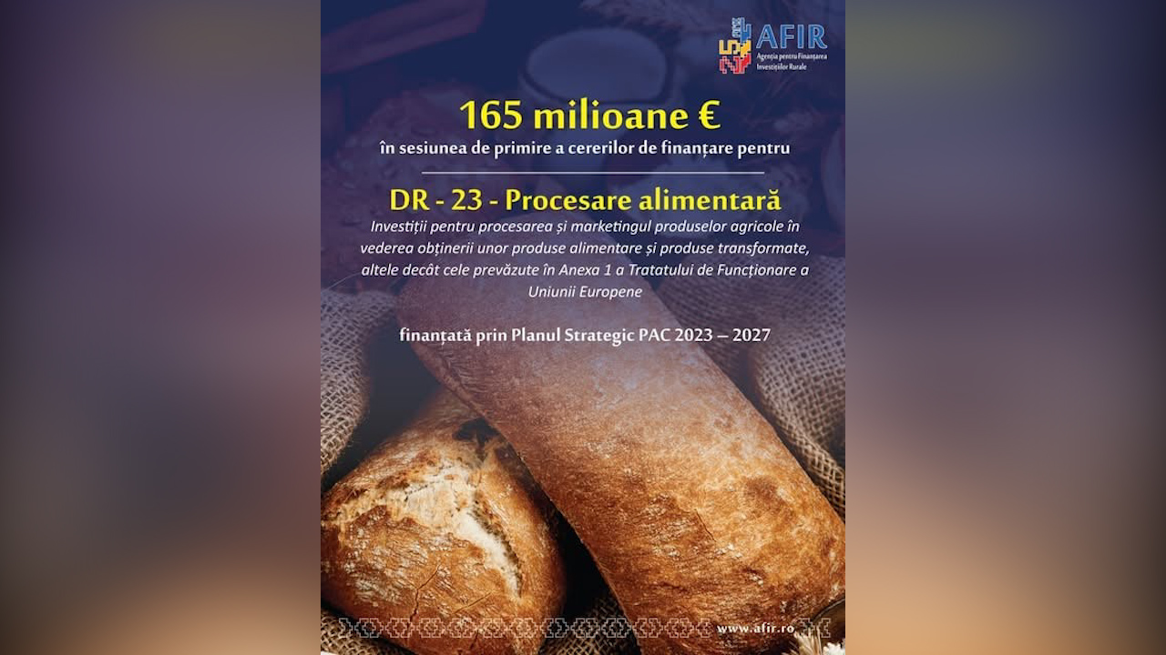 Începând cu 15 decembrie 2025, AFIR deschide sesiunea de depunere a proiectelor prin intervenția DR-23, punând la dispoziție 165 de milioane de euro pentru investiții în unități de procesare și marketing al produselor agricole, finanțate prin Planul Strategic PAC 2023–2027.