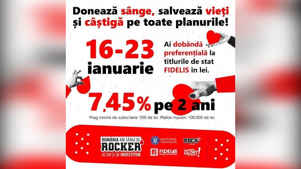 Ministerul Finanțelor continuă și în anul 2026 parteneriatul cu Rock FM și Morning Glory cu Răzvan Exarhu și recompensează solidaritatea socială prin tranșa dedicată donatorilor de sânge cu o dobândă de 7,45%, la titlurile de stat în lei cu scadență la 2 ani.
