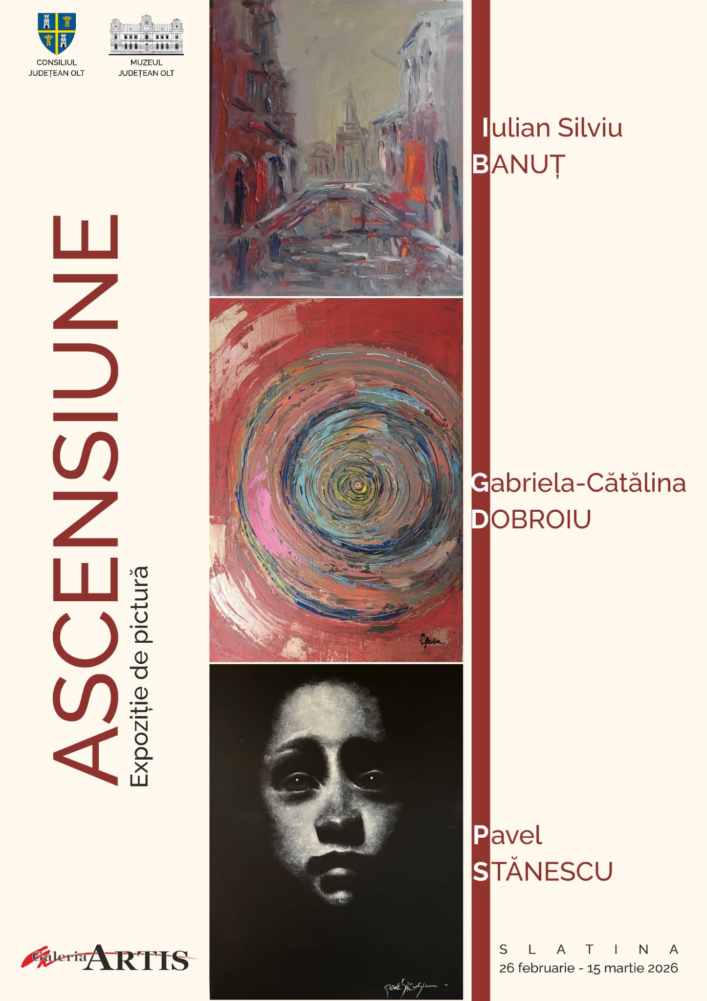 Muzeul Județean Olt vă invită să vizitați, începând de joi, 26 februarie 2026, la Galeria ARTIS, expoziția ASCENSIUNE, semnată de artiștii Iulian Silviu Banuț, Cătălina Gabriela Dobroiu și Pavel Stănescu.