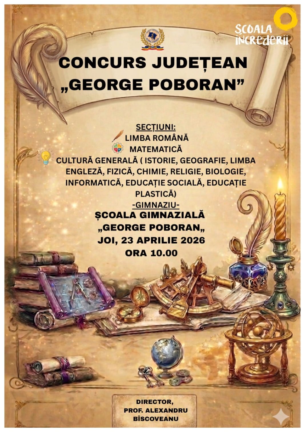 „ Concursul este o activitate educativă interdisciplinară și își propune să promoveze excelența școlară, gândirea critică, spiritul competitiv și creativitatea elevilor din ciclul gimnazial, în concordanță cu valorile educaționale promovate de profesorul George Poboran, dascăl și cărturar oltean. Prin organizarea acestui concurs, organizatorii și-au propus să stimuleze interesul elevilor pentru cunoaștere și performanță școlară, dezvoltarea competențelor de comunicare, analiză și interpretare la limba și literatura română, exersarea gândirii logice și creative în rezolvarea problemelor de matematică, cultivarea curiozității și a dorinței de autodepășire prin activități de cultură generală, promovarea spiritului de competiție și fair-play, precum și consolidarea parteneriatelor educaționale la nivel județean”.