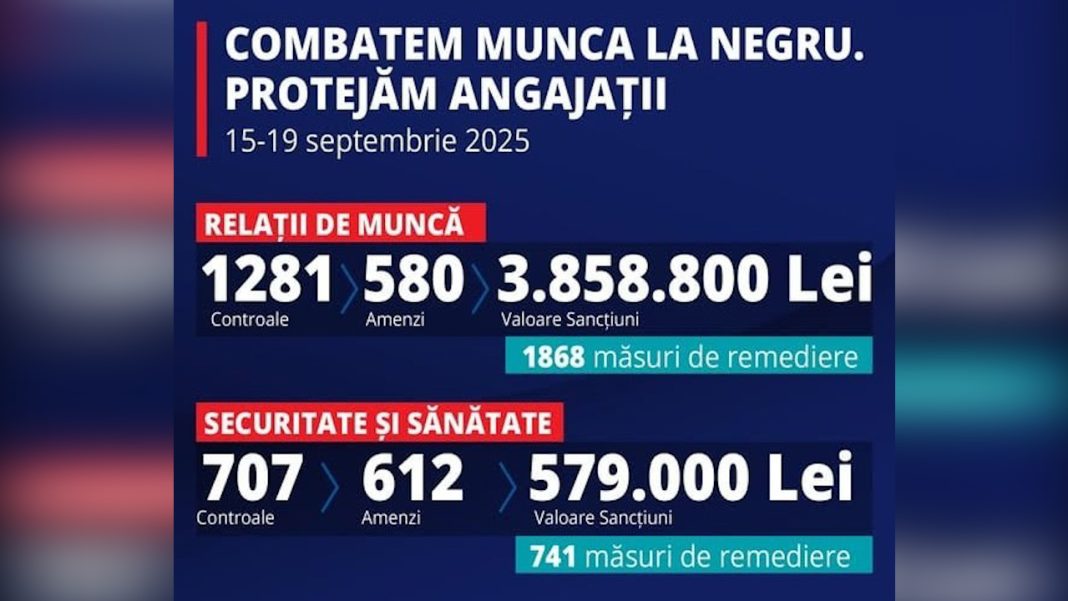 În săptămâna 15-19.09.2025, Inspecția Muncii a efectuat 1.988 de controale, dintre care 1.281 au vizat domeniul relațiilor de muncă (RM) și 707 domeniul securității și sănătății în muncă (SSM).