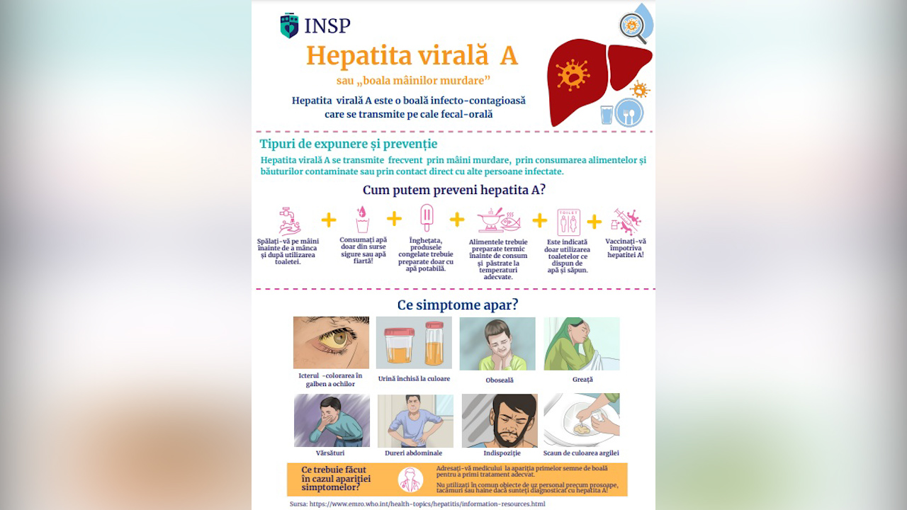 Dat fiind faptul că, cele mai multe cazuri raportate de Hepatită virală A, au fost raportate în lunile septembrie-octombrie, Direcția de Sănătate Publică Olt, a întocmit un comunicat de presă cu simptomatologia acestei afecțiuni, populația afectată, modul de transmitere a bolii, contagiozitatea, dar și măsuri de prevenire.