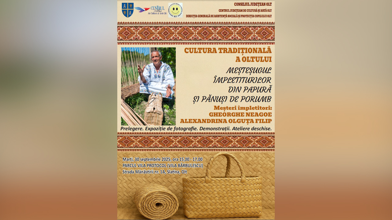 O etapă pilot a proiectului „Cultura tradițională a Oltului” se va desfășura marți, 30 septembrie 2025, între orele 15.00-17.00 în Parcul Vilei de protocol a Consiliului Județean Olt (fosta Vila Bărbulescu), inițiator fiind Centrul Județean de Cultură și Artă Olt (Secția P.P.I.S.C.C.P.C.T. în colaborare cu Secția Arte și Meșteșuguri), în parteneriat cu Direcția Generală de Asistență Socială și Protecția Copilului Olt, cu sprijinul Consiliului Județean Olt.