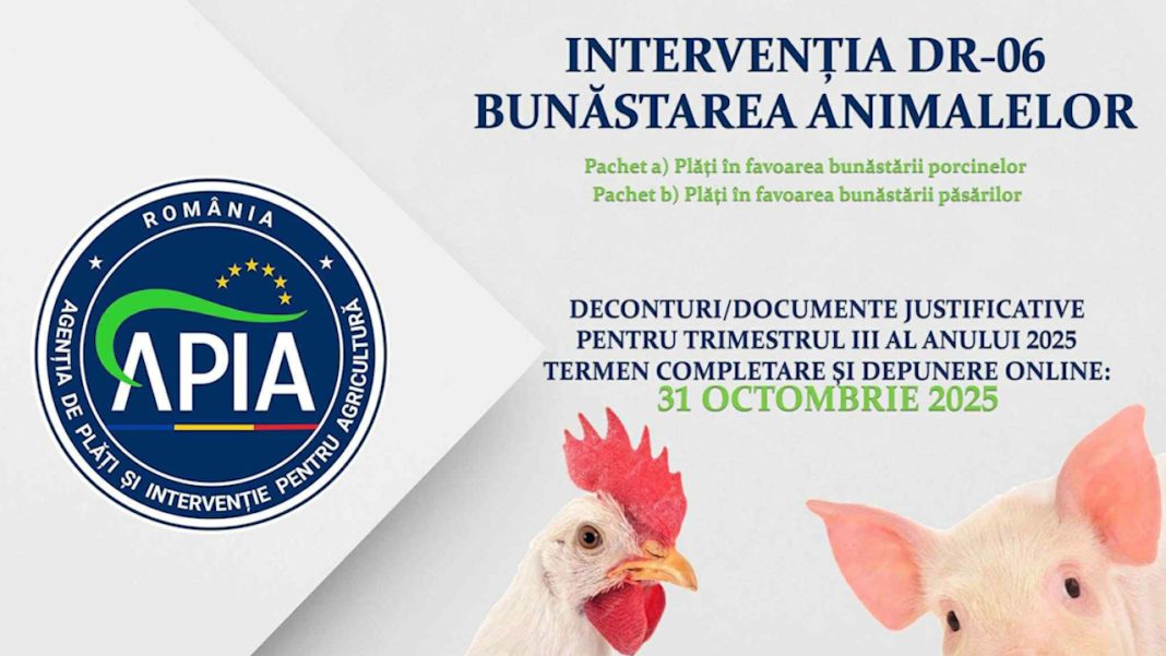 Agenția de Plăți și Intervenție pentru Agricultură (APIA) reamintește beneficiarilor care și-au asumat angajamente pentru Intervenția DR 06 – „Bunăstarea animalelor” – pachetul a) – Plăți în favoarea bunăstării porcinelor și pachetul b) – Plăți în favoarea bunăstării păsărilor, că până la data de 31 octombrie se pot completa și depune online deconturile/documentele justificative aferente trimestrului III anul 2025.