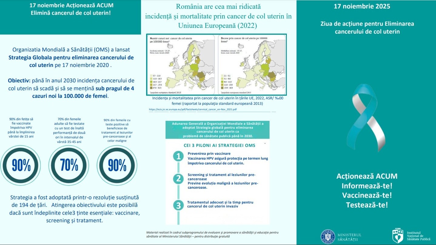 Institutul Național de Sănătate Publică își reafirmă angajamentul de a proteja sănătatea femeilor și de a reduce povara uneia dintre cele mai prevenibile forme de cancer. Obiectivul Strategiei de Eliminare a Cancerului de col uterin, lansat de Organizația Mondială a Sănătății în anul 2022, de a reduce incidența și menține incidența cancerului de col uterin la mai puțin de 4 cazuri noi la 100.000 de femei este realizabil. Vaccinarea anti-HPV a 90% din fetițe: oferă protecție dovedită împotriva tipurilor de HPV responsabile de majoritatea cazurilor de boală. Screeningul sistematic a 70% din femeile adulte cu un test de înaltă calitate care depistează infecția cu HPV în cadrul programelor organizate pe baze populațională, care permite depistarea timpurie a leziunilor precanceroase. Accesul la diagnostic și tratament a 90% din femeile depistate cu leziuni ale colului uterin, esențial pentru prevenirea evoluției bolii.