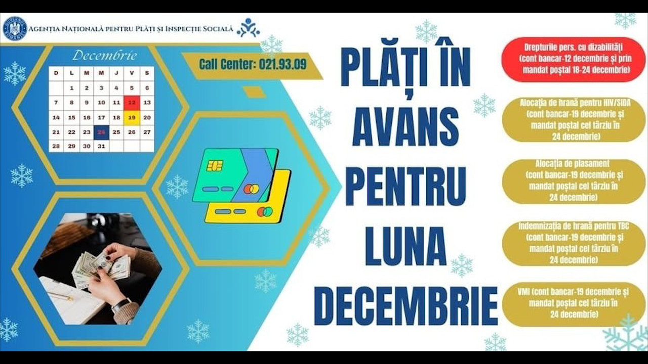 Pentru a se asigura de faptul că cetățenii primesc banii înainte de Sărbătorile de iarnă, ANPIS prin agențiile teritoriale va vira în avans sumele pentru beneficiile de asistență socială care de regulă se plăteau spre final de lună.