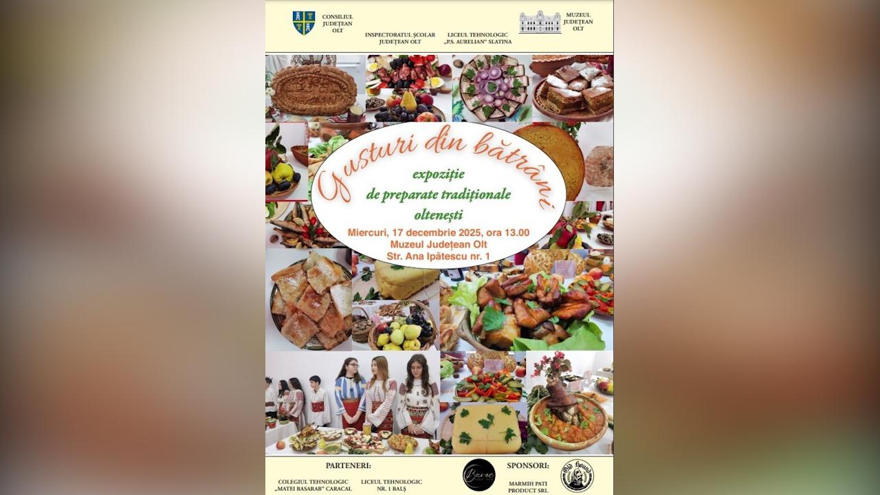 Miercuri, 17 decembrie 2025, ora 13,00, la sediul Muzeului Județean Olt va avea loc o expoziție de preparate tradiționale oltenești specifice sărbătorilor de iarnă. Expoziția este organizată în parteneriat cu Liceul Economic „P. S. Aurelian” Slatina, la care au aderat agenții economici: OLD HOUND, reprezentat de dl. Cătălin Ștefănescu și MARIMIH PATI PRODUCT SRL, reprezentat de dl Mihai Mîndroc în calitate de sponsori ai acestei activități.