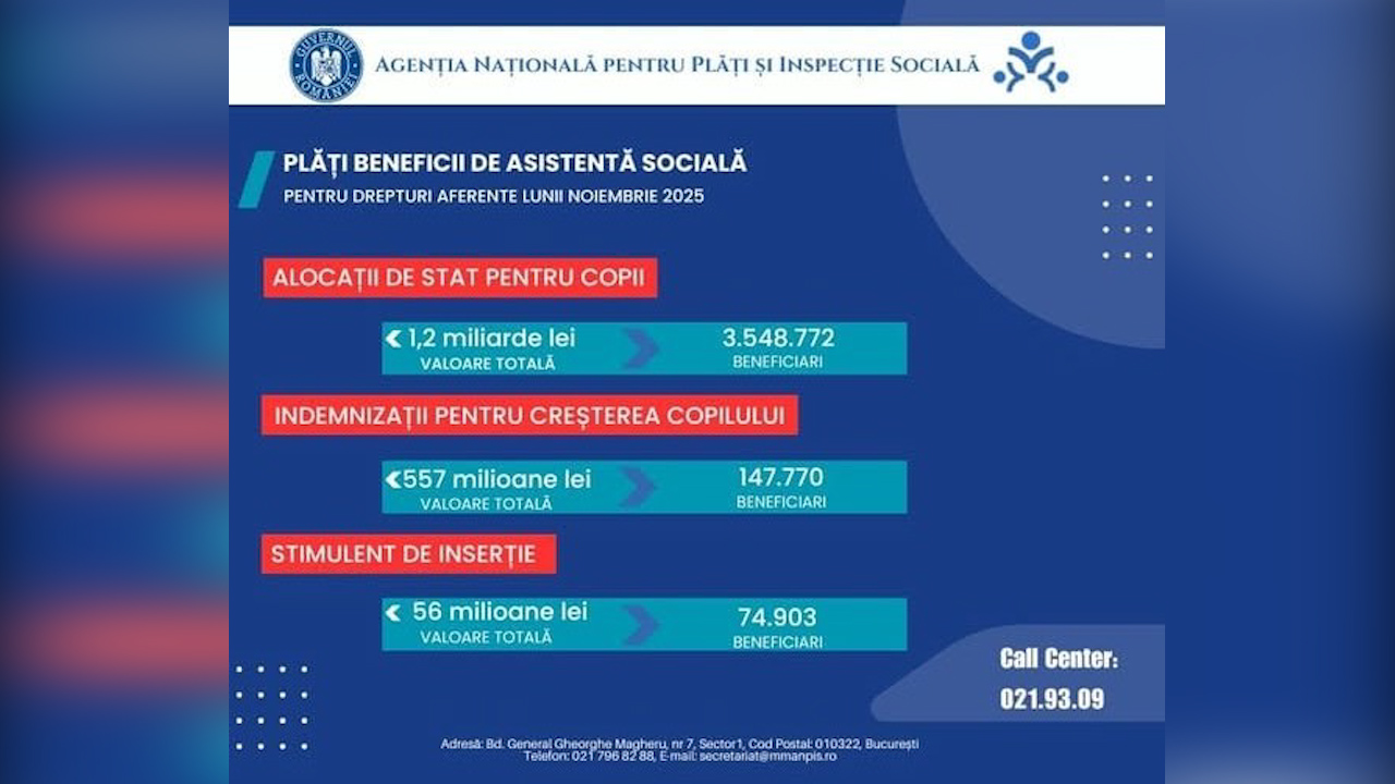 Agenția Națională pentru Plăți și Inspecție Socială (ANPIS), prin agențiile teritoriale, a virat integral fondurile necesare plății tuturor beneficiilor de asistență socială aferente lunii noiembrie 2025, destinate unui număr de 5.121.672 de beneficiari, în valoare totală de 2.231.487.975 lei.