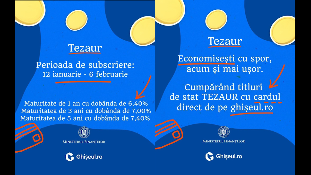 În perioada 12 ianuarie 2026 – 6 februarie 2026, românii pot investi în titlurile de stat TEZAUR, cu maturități de 1, 3 și 5 ani și dobânzi anuale de 6,40%, 7%, respectiv, 7,40%.