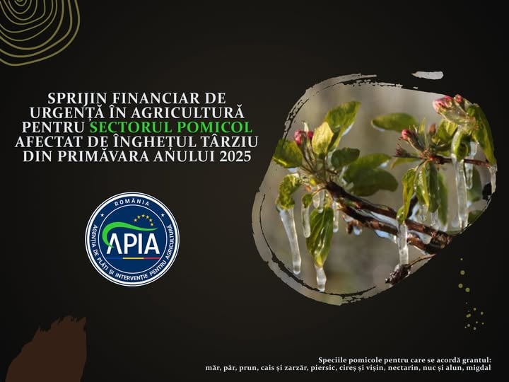 Agenția de Plăți și Intervenție pentru Agricultură (APIA) informează că, până la data de 09 martie 2026 inclusiv, primește cereri de acordare a sprijinului de urgență pentru sectorul pomicol afectat de înghețul târziu de primăvara din perioada aprilie – mai 2025.