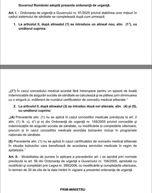 Ministerul Sănătății a publicat, în transparență decizională, un proiect de ordonanță de urgență pentru completarea OUG nr. 91/2025, actul normativ care prevede ca, în perioada 1 februarie 2026 – 31 decembrie 2027, indemnizațiile de concediu medical „se calculează și se plătesc prin diminuarea cu o zi”.