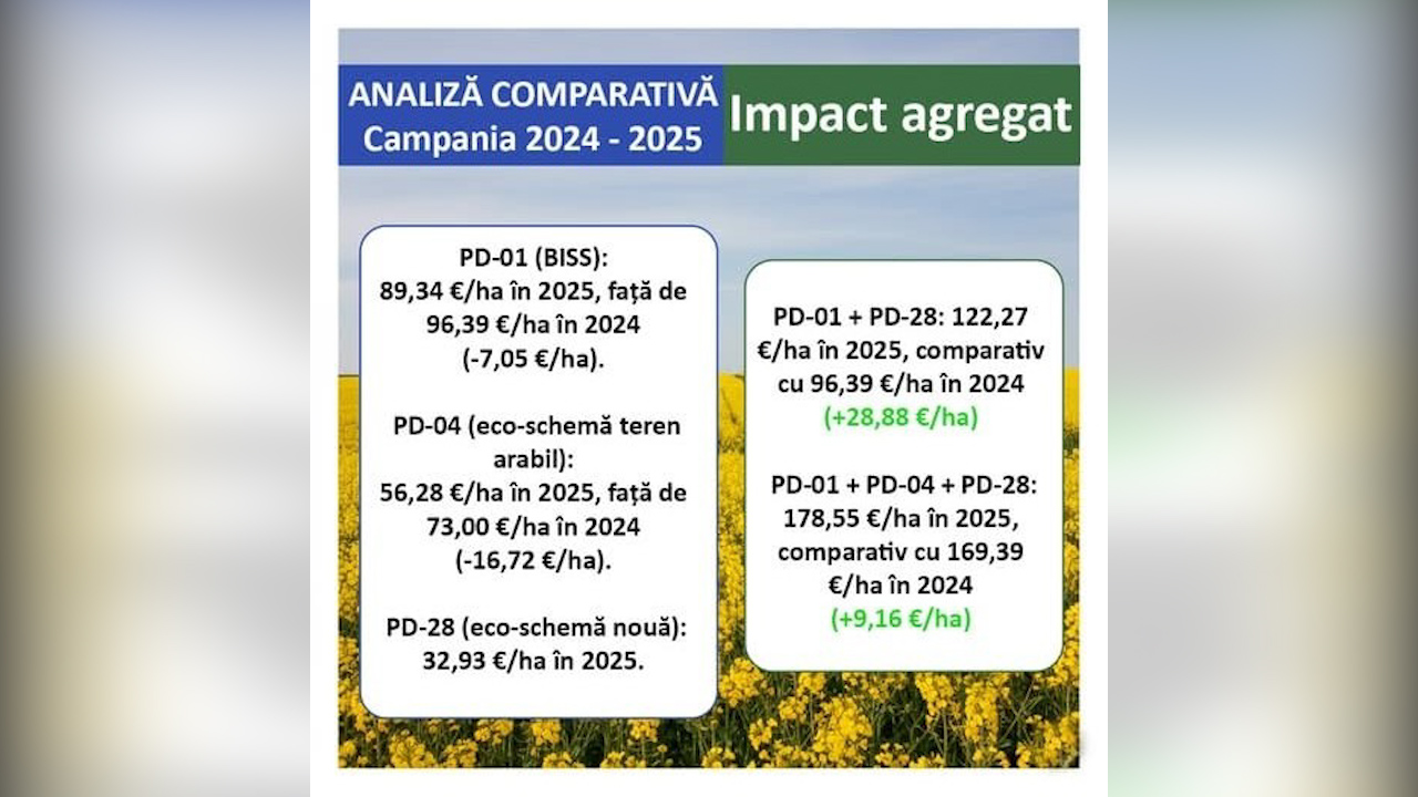 Concluzia economică este clară: fermierii care au accesat PD-28 în 2025 înregistrează un nivel total al sprijinului pe hectar superior celui din 2024.