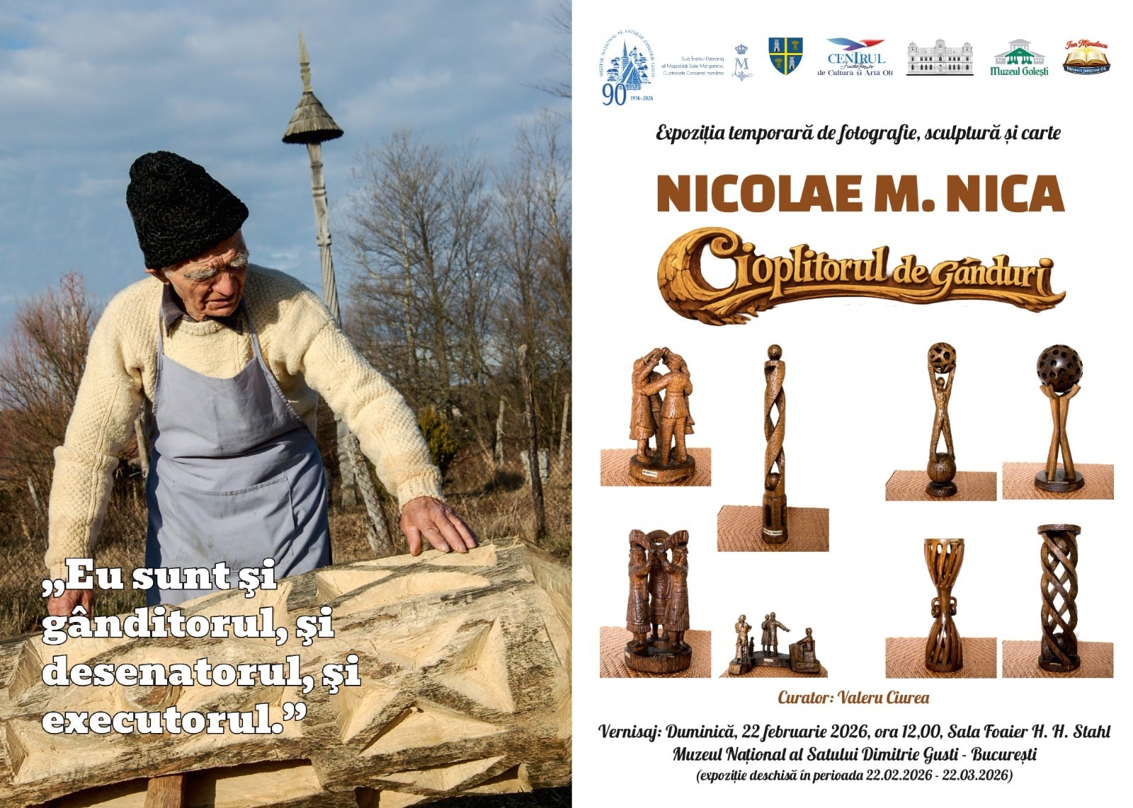 Muzeul Național al Satului Dimitrie Gusti, Centrul Județean de Cultură și Artă Olt, Muzeul Județean de Istorie Olt, Muzeul Viticulturii și Pomiculturii Golești și Biblioteca Județeană Olt Ion Minulescu vă invită duminică, 22 februarie 2026, de la ora 12.00, la vernisajul expoziției de fotografie și sculptură intitulată „Cioplitorul de gânduri”. Evenimentul este dedicat memoriei creatorului popular și colecționarului de excepție Nicolae M. Nica, creatorul celei mai mari colecții private de artă populară din Podișul Cotmenei care, prin adăugarea sutelor de sculpturi în lemn și os, a devenit un adevărat muzeu care astăzi îi poartă numele, aflat la Chilia, comuna Făgețelu, județul Olt.