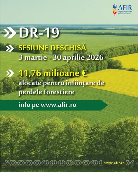 Sesiunea de primire a cererilor de finanțare pentru intervenția DR-19 se deschide pe 3 martie 2026, ora 9:00 și se închide pe 30 aprilie 2026, ora 16:00, sau după epuizarea fondurilor alocate.