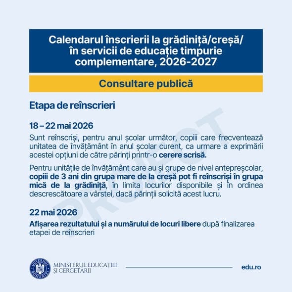 Calendarul de înscriere la creșă/grădiniță și în serviciile de educație timpurie complementare pentru anul școlar 2026-2027, în consultare publică