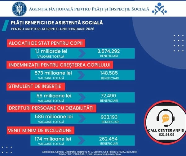 Agenția Națională pentru Plăți și Inspecție Socială (ANPIS), prin agențiile teritoriale, a virat în această lună fondurile necesare pentru plata beneficiilor de asistență socială aferente lunii februarie 2026, după cum urmează:
