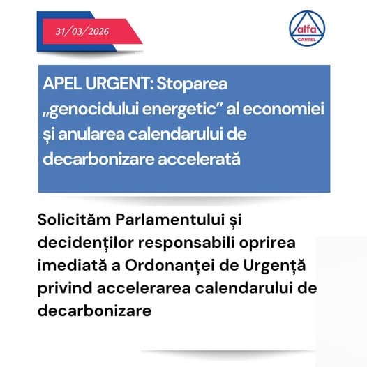Confederația Națională Sindicală „Cartel ALFA” solicită Parlamentului și decidenților responsabili oprirea imediată a Ordonanței de Urgență privind accelerarea calendarului de decarbonizare. Închiderea centralelor pe cărbune, fără a avea alternative funcționale, este o decizie care condamnă România la dependență energetică și regres economic.