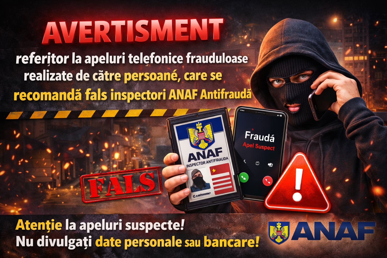 ANAF Antifraudă: „Reiterăm avertizarea referitoare la continuarea tentativelor de înșelare prin vishing (phishing telefonic), prin care este furată identitatea unor inspectori ai Direcției Generale Antifraudă Fiscală din cadrul Agenției Naționale de Administrare Fiscală și se încearcă obținerea de date personale și bancare.